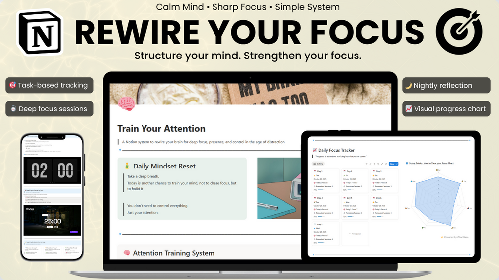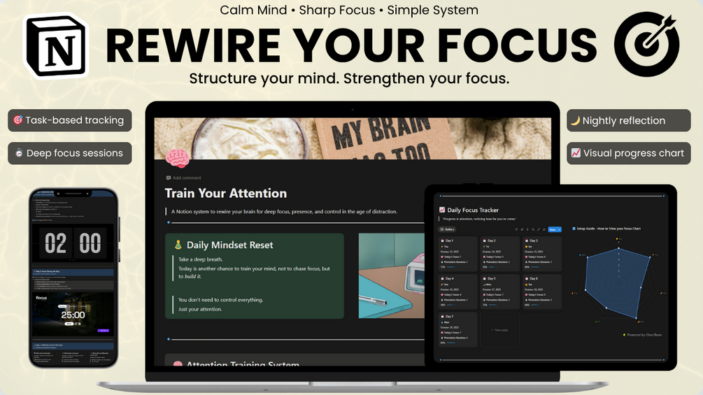 This Notion Focus Training System helps you reclaim it through a simple 3-step daily routine designed for clarity, discipline, and calm productivity.